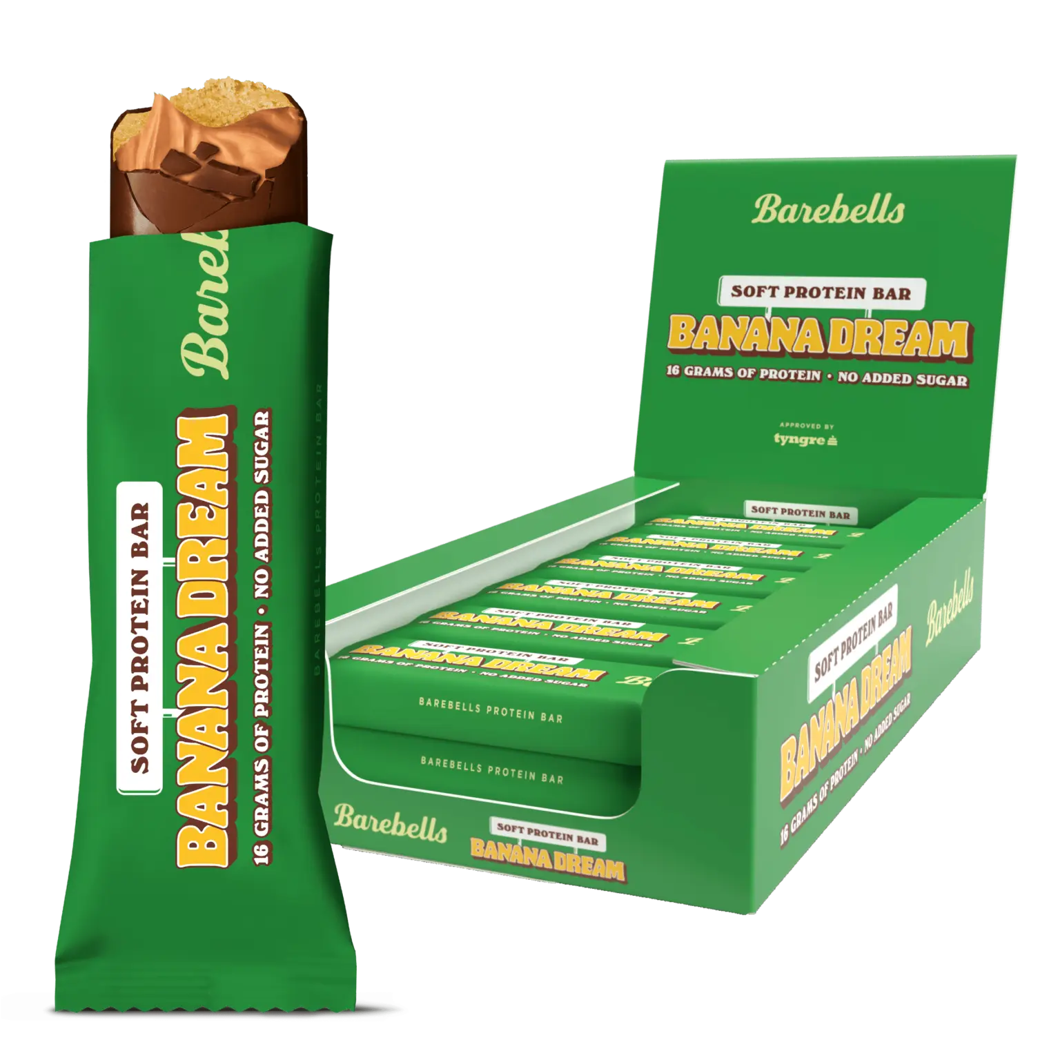 Uanset om du har gode eller dårlige barndomsminder med denne smagskombination af banan, karamel og chokolade, vil dine smagsløg takke dig for at sætte tænderne i denne nostalgiske sag. Barebells Banana Dream Soft Bar er alt, hvad du forestiller dig og mere til – her får du en blød kerne med smag af banan, toppet med cremet karamelsauce og overtrukket med silkeblød mælkechokolade. Det absolut perfekte bud, når den lette sult skal stilles, eller du bare har lyst til et sundere alternativ til de traditionelle chokoladebarer.Barebells Banana Dream er beriget med 16 gram protein, indeholder 205 kcal pr. bar og er uden tilsat sukker.