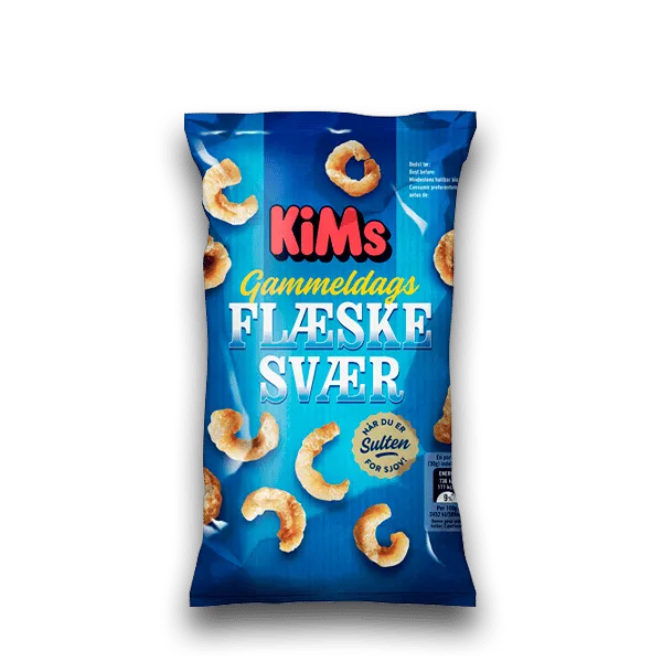 Kims Gl. Flæskesvær (18x60gr) Indhold: 60,0 gLand: Danmark KiMs Gammeldags Flæskesvær har den helt rigtige smag som i gamle dage. Perfekt sprøde og saltede flæskesvær, fremstillet af grise af bedste kvalitet. Det gode bid og den lette saltning gør det til en sand fornøjelse og enhver flæske-elskers drøm. Men pas på hvis du sætter dem på bordet, for der kan nemt komme kamp til stregen om de lækre stykker flæsk.