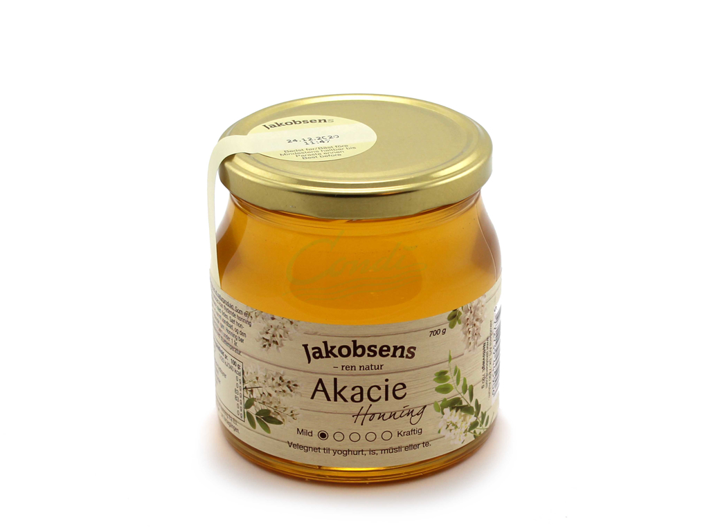 Dansk Jacobsens akaciehonning. Med sit høje frugtsukkerindhold forbliver denne honning flydende og er perfekt til yoghurt, is, müsli og te. Den milde smag gør den populær som et naturligt sødemiddel. Ren, dansk kvalitet med Jacobsen akaciehonning. Bemærk, at da det er et naturprodukt, kan honningen krystallisere over tid. Løsningen er enkelt: placér honningen i et varmt vandbad for at genoprette dens flydende konsistens.