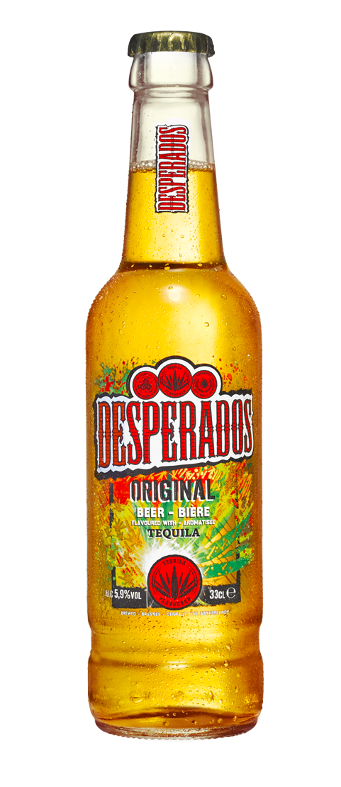 Indhold: 33,0 cl Alkohol: 5,9 % Land: Frankrig Desperados Cerveza er en lys øl med en frisk smag af tequila. Den har en let bitter smag med et strejf af citrus. Det spanske navn Desperados Cerveza kan snyde lidt, da det er en øl, der bliver produceret i Frankrig. Det hedder sig, at den franske producent ikke kunne finde på et navn til sin nye øl, og derfor endte med at være ‘desperado’. Nyd den forfriskende øl til mexicansk mad eller til sushi. Den bitre smag går godt til stærke retter, og det klæder den med en skive frisk limefrugt.