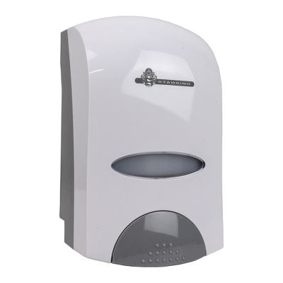 Dispenser, Stadsing, t/flydende sæbe, 1L Hvid plastdispenser til manuel dosering af sæbe, som giver 1 ml pr. tryk.