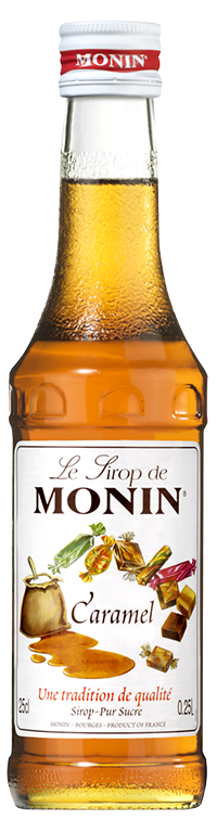 Karamel er lavet ved at smelte sukker i vand for at lave en rig, sød, klæbende væske som varierer i farven fra beige til rav til mørkebrun. Karamel bruges oftest som smag i slik eller i budding, desserter, kager og kiks, karamel kombineres godt med andre smagsvarianter såsom frugter. Monin Syrup Caramel præsenterer en mørk ravfarve med kobbergule glimts og en kraftfuld, samt dyb karamel aroma, der ledsages af en meget specifik brændt karamel smag. Monin Syrup Caramel kan bruges til at lave søde kaffe-, te- og chokoladedrikke, behagelige dessert cocktails, vodkashots eller ganske simpelt hældt over flødeis.