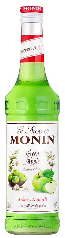 Grønne æbler er sprøde, saftige og derfor fremragende til både madlavning og til at spise rå. Den mest kendte grønne æblesort er Granny Smith, som siges at have sin oprindelse i Australien. Monin Syrup Green Apple præsenterer en klar lysegrøn farve med gule glimts og en aroma af frisk skåret Granny Smith æbler, der ledsages af en syrlig, sød og saftig smag af grønne æbler, som gør den meget forfriskende. Den perfekte balance mellem det søde og sure i Monin Syrup Green Apple gør den perfekt i lemonade eller Martini cocktails, men den er også rigtig lækker i sodavand, frugtpunch, smoothies eller te.