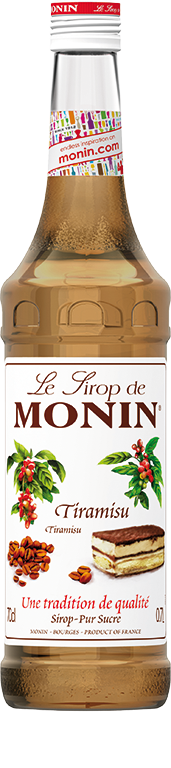 Tiramisu er en kendt lækker og cremet italiensk dessert, der er lavet på en kombination af kiks, kaffe, kakao, marsala likør og mascarpone. Monin Syrup Tiramisu tilbyder en intens rav farve, aromaer af chokolade med en antydning af kiks, og en smag der ligeledes har chokolade noter med ristede nødder. Denne syrup kan eksempelvis nydes i kaffe, frosne cocktails og dessertdrikke.