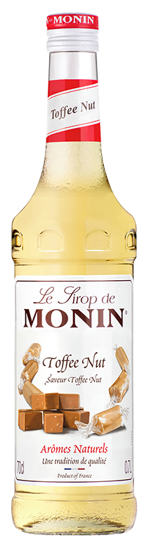 Monin Syrup Toffee Nut er inspireret af det populære slik fra den britiske slikvirksomhed Qualiry Street. Monin Syrup Toffee Nut præsenterer en klar og gylden lysegul farve sammen med en stærk karamel aroma, som ledsages af en smag med noter af smør, ristede nødder og fed macadamianødder i en rig og smøragtig karamel base. Monin Syrup Toffee Nut er perfekt i de lidt tungere drikke, såsom kaffe- chokolade- og mælkedrikke, og kan give et uimodståeligt twist til din latte, skabe en forførende dessert drink eller fantastisk som topping til is.