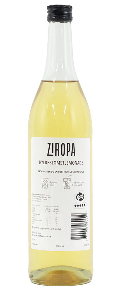 Ziropa Hyldeblomstlemonade Indhold: 70 cl. Enhed: Flaske Pant: A Antal pr. kolli: 6 Land: Danmark En klassiker med et twist. Forkæl dig selv med den forfriskende smag af vores hyldeblomstlemonade. En lemonade, der perfekt fanger sommerens essens i hver tår. Lavet med de fineste ingredienser er vores hyldeblomstlemonade et sandt bevis på kvalitet og smag. Hyldeblomstens blomsterrige smag er perfekt afbalanceret med søde og syrlige noter. Det er derfor en mere frisk og syrlig hyldeblomstlemonade, som passer til hele familien. En delikat variant af hyldeblomst med harmoni af blomstersmag, gyldne nuancer & kvalitet i hver eneste tår.