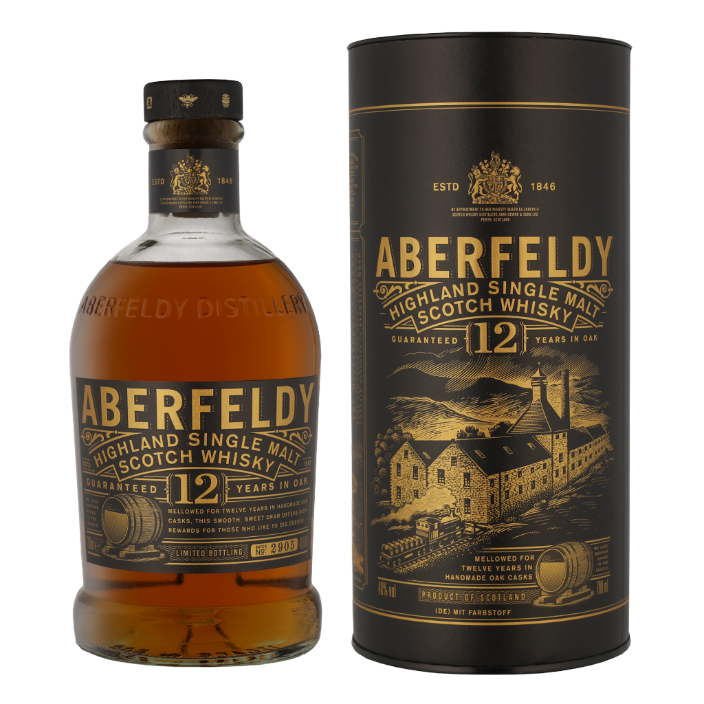 Aberfeldy 12 YO Highland Single Malt er en frugtagtig, ren og poleret malt med et anstrøg af honning og krydderier, den er en fremragende introduktion for destilleriet Highland Distillery. Aberfeldy 12 YO Highland Single Malt præsenterer en frisk og frugtagtig duft af frisk melon, grønne æbler og pære, sammen med varmt toast og honning samt et drys af revet muskatnød. Duften ledsages af en dejlig glat tekstur i munden med rige sukkersøde frugtsmag friskede op med sprød æble. Den er blid og sødt krydret hvilket øger kompleksiteten. I eftersmagen opleves den langsomt dvælende med de sukkersøde frugt smag i slutningen. Aberfeldy 12 YO Highland Single Malt kan både nydes med vand eller is, men er også fantastisk alene.