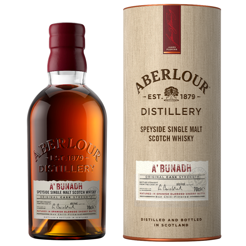 Aberlour A'Bunadh Speyside Single Malt er en unik cask strength whisky, der har opnået kultstatus blandt whiskykendere. Aberlour A'Bunadh Speyside Single Malt betyder ”den oprindelige” på gælisk, og er lavet som en hyldest til Aberlours grundlægger, James Fleming, ved brug af kun traditionelle metoder uden kold filtrering eller andre moderne processer. Resultatet er en tungere og mere cremet single malt end de fleste nogensinde har oplevet. Aberlour A'Bunadh Speyside Single Malt præsenterer aromaer af alle krydderier heriblandt praline og krydret appelsin i harmoni med dybe noter af oloroso sherry, der ledsages af en smag af appelsin, sorte kirsebær, tørret frugter og ingefær med mørk bitter chokolade og dvælende sherry. Teksturen er både fyldig og cremet, og det hele udvikler sig til en robust og langtidsholdbar eftersmag med bittersøde noter af eksotiske krydderier, mørk chokolade og eg. Aberlour A’Bunadh Speyside Single Malt kan nydes med en smule vand eller isterninger, men er også dejlig helt alene.