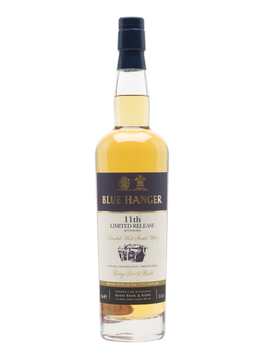Blue Hanger 11th Limited Release Blended Malt er en limited edition-whiskey fra Berry Bros & Rudd-destilleriet, der har haft hjemme i London siden 1698. Whiskyen er en blanding af hele otte fade – fire hogshead, tre tidligere sherry-fade og én puncheons-fad. Whiskyen indeholder både tørvet og ikke-tørvet Bunnahabhain, hvilket er med til at give en kompleks smagssammensætning. Whiskyens næse byder på citrusfrugt, honning, nødder, vanilje, marcipan og en smule tørverøg. Ganen er meget maltet med noter af krydderier, eg, kakao, mokka, appelsinskal og gule æbler. Eftersmagen er cremet og sød, men de røgede og krydrede noter fortsætter også. Servér for sig selv eller over is – dryp med fordel lidt vand i whiskyglasset.