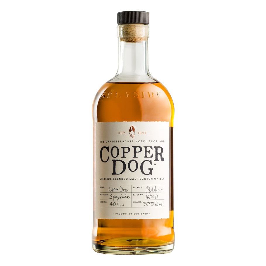 Copper Dog Speyside Blended Malt Scotch præsenterer en lækker frugtagtig smag med et strejf af honning, karamel, vanilje og krydderier. Denne whisky er en kombination af 8 enkeltmalt whiskyer, som opsummerer alt det, der er godt ved Speyside. Copper Dog Speyside Blended Malt Scotch blev skabt af Masterblender, Stuart Morrison, som en hyldest til alle desstillationsarbejdere. Den har sine rødder i The Craigellachie Hotel, der er beliggende i hjertet af Speyside. Det er en whisky, som varmt kan anbefales, og som både kan drikkes ren ved stuetemperatur eller blandes i en drink eller cocktail.