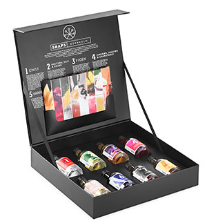 Snaps Bornholms gaveæske indeholder 8 økologiske snapse i følgende varianter: Chili; Havtorn, Dild & Agurk; Figen; Hindbær, Ingefær & Granatæble; Vanilje; Blåbær & Citron; Lakrids, Chili & honning