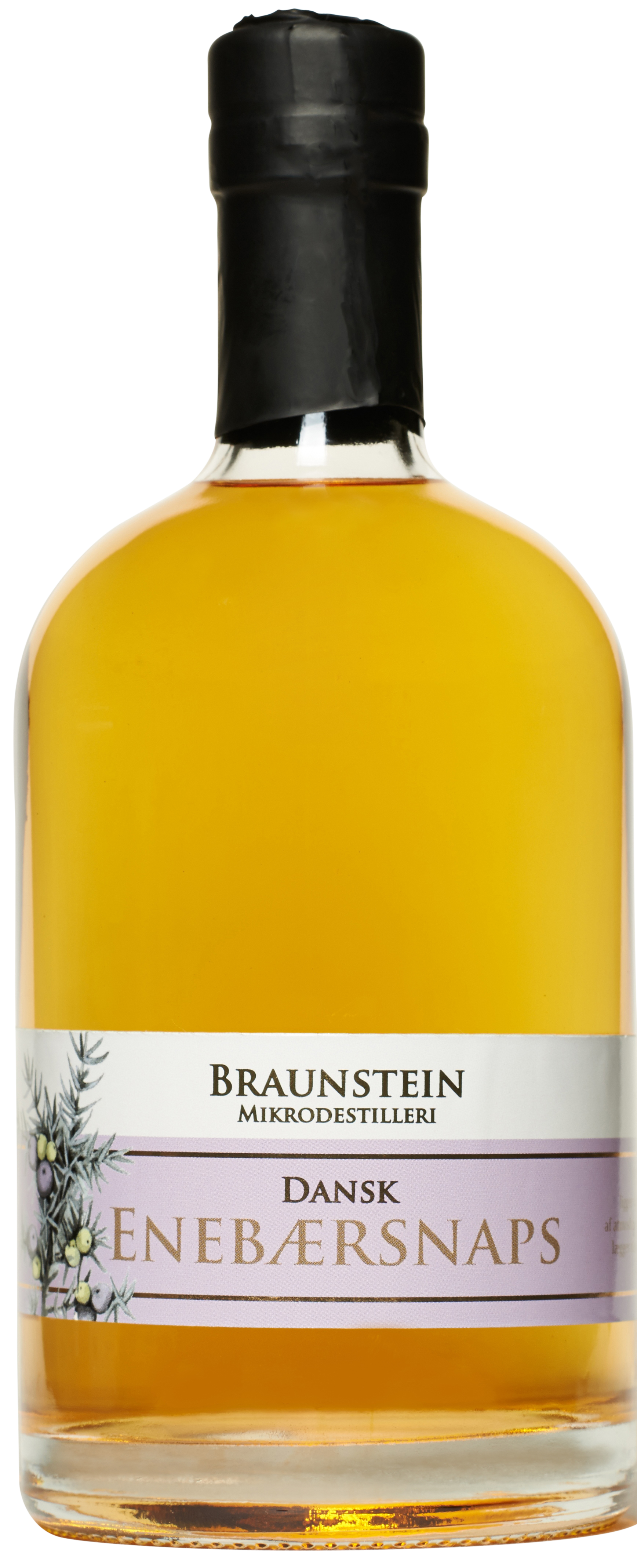 Brødrene Claus og Michael Braunstein brugte hvert år som børn, en pæn del af deres sommerferie på, at hjælpe deres farfar med at samle porse og sortebær langs den jyske vestkyst, så han kunne lave sine kryddersnapse. missionen med Braunsteins destilleri, var at relancere den danske snaps, med rødder i farfarens gamle opskrifter, til de danske frokostborde. Det er ikke lige til at se, men enebær er faktisk slet ikke bær, men derimod runde kogler fra enebusken. De er særdeles aromatiske og meget anvendte i madlavning såvel som i spiritusproduktion. Man har desuden valgt at tilsætte en gavmild dosis allehånde, der runder smagen af og trækker brændevinen lidt i retning af en bitter. Braunstein Enebærsnaps præsenterer en gylden farve, med en fyldig duft af enebær, allehånde, lavendel, salvie og harpiks, der ledsages af en smag, som er præget af en tør, kraftig og intens smag af enebær og tørrede blomster. Braunstein Enebærsnaps Bør nydes ved stuetemperatur og passer perfekt til røget laks eller vildt.