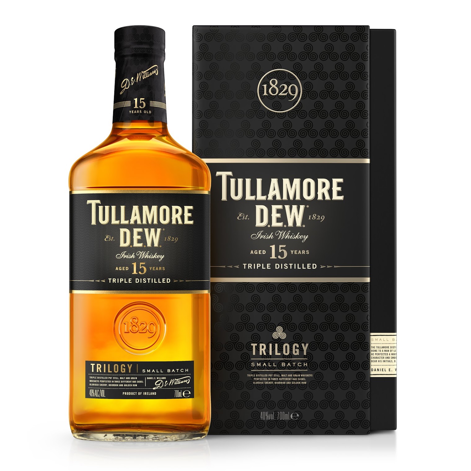 Tullamore DEW “Trilogy” 15 YO har sit navn fra de tre unikke processer, der sker i forbindelse med fremstillingen af whiskeyen: Destillation, blending og ældning i fin eg. Whiskeyen her laves ved at blande tre typer af tredobbelt-destilleret irsk whiskey: Pot still, malt og grain (hvilket naturligvis også bidrager til “Trilogy”-navnet). Whiskyens næse er rig, nøddeagtig og krydret med en snert af tropisk frugt. Paletten byder på en rig og kompleks kombination af frugt-, nødde- og kryddernoter. Whiskyen er både cremet og fyldig i sin krop. Eftersmagen er rig, lang og intens. Servér whiskyen helt for sig selv, over is eller med et par dråber vand i.