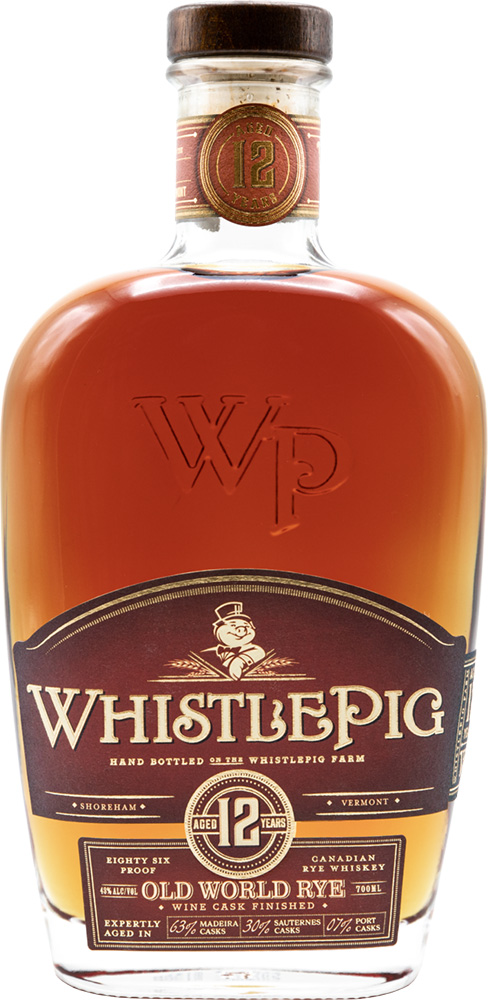 Denne 12-års Rye Whiskey er en sammenføring af whiskyer, der er lagret i fade af Madeira (63%), Sauternes (30%) og Port (7%). WhistlePig 12 års Rye Whiskey er aftappet ved en styrke på 43% (86 proof), og har en fantastisk smagsprofil med noter af abrikoser, blommer, rosiner, dadler og honning, og en finish af mørk chokolade, karamel og vanilje.”Old World” er resultatet af et 4 års langt innovationseksperiment, der omfattede opbygning og undersøgelse af et dusin af unikke finishes, blends og input fra over 500 bartendere. Resultatet er en whisky, der tager de elementer, der er mest kvintessielle i en amerikansk Rye Whiskey - dristighed og karakter - og smelter dem sammen med samme elegance og nåde som en 18 år gammel Scotch.